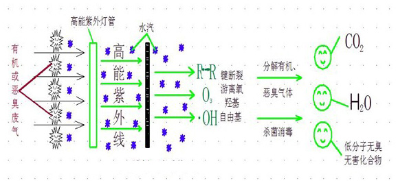 利用特制的高能高臭氧UV紫外線光束照射有機(jī)氣體及空氣中的氧分子,裂解有機(jī)氣體的分子鍵,并分解空氣中的氧分子產(chǎn)生游離氧,即活性氧,UV+O2→O-+O*(活性氧)O+O2→O3(臭氧)。游離狀態(tài)的污染物分子與臭氧氧化結(jié)合成小分子無害或低害的化合物,如CO2、H2O等。從而達(dá)到凈化氣體的效果。凈化能力可達(dá)95%。